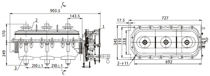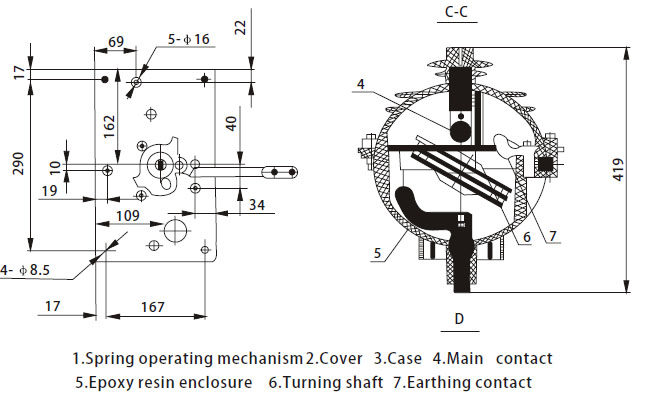 FLRN36-12D indoor AC high-voltage load break switch is equipped with double breaks, three working positions (connect,disconnect and grounded) and rotary moving contact. It uses SF6 for arcing and insulating medium. Moving contact,stable contact and grounded contact are installed in epoxy resin enclosure by compressing casting. The operation mechanism is reliable and simple which can be operated by manual and motor. The reliable mechanical interlock device together with the switc h body makes 5-protection functions.