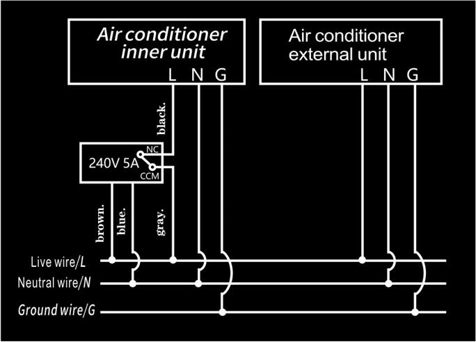 5. Ensure that the voltage used is in accordance with the product identification. Connect the two-core power cord marked "Power Cord" to the air conditioner or socket, and pay attention to the color of the cable;