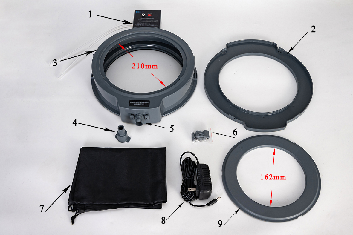 Main body, controller, charger, bottom protective cover, storage bag, 162mm diameter changeover cover, 15/25mm water outlet connector, fixing clips.